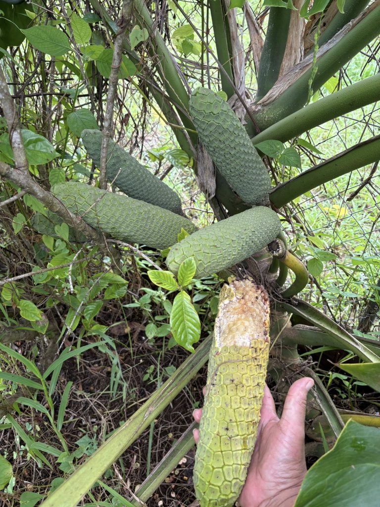 La récolte du ceriman plant s’étire sur plusieurs jours. On consomme uniquement les segments dont les écailles tombent seules pour éviter les brûlures buccales.