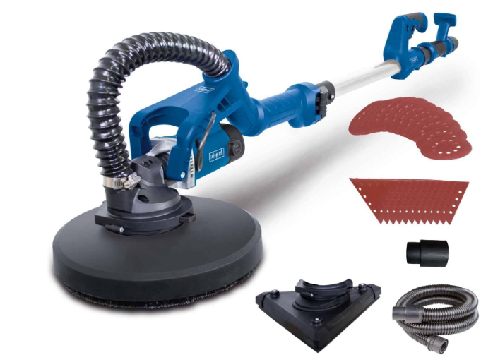 La Scheppach DS930 est une ponceuse girafe filaire de 710 W conçue pour le ponçage des murs et plafonds avec efficacité. Elle dispose d’un plateau circulaire de 215 mm ainsi que d’une tête triangulaire interchangeable, permettant de couvrir de grandes surfaces tout en accédant facilement aux angles. Sa vitesse variable de 1 200 à 2 500 tr/min (jusqu’à 7 500 tr/min avec tête triangulaire) s’adapte aux différents supports, tandis que le bras télescopique facilite le travail en hauteur sans escabeau.